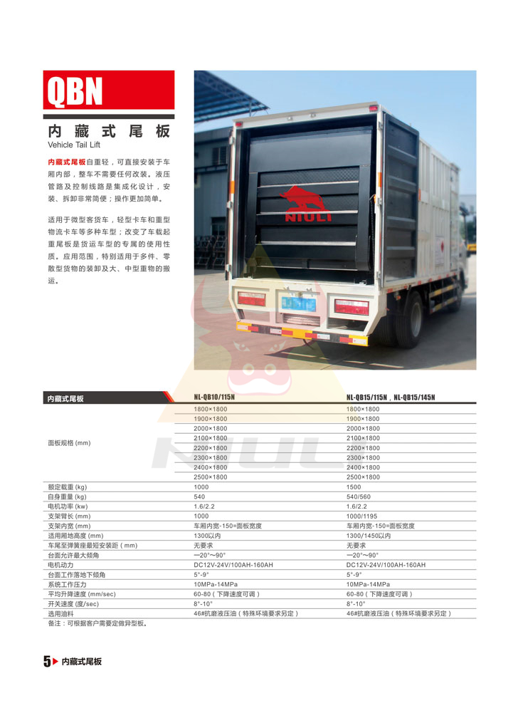 內藏式尾板自重輕,可直接安裝于車廂內部,整車不需要任何改裝,液壓管路及控制線路是集成化設計,安裝、拆卸非常簡便;操作更加簡單。適用于微型客車,輕型卡車和重型物流卡車等多種車型。