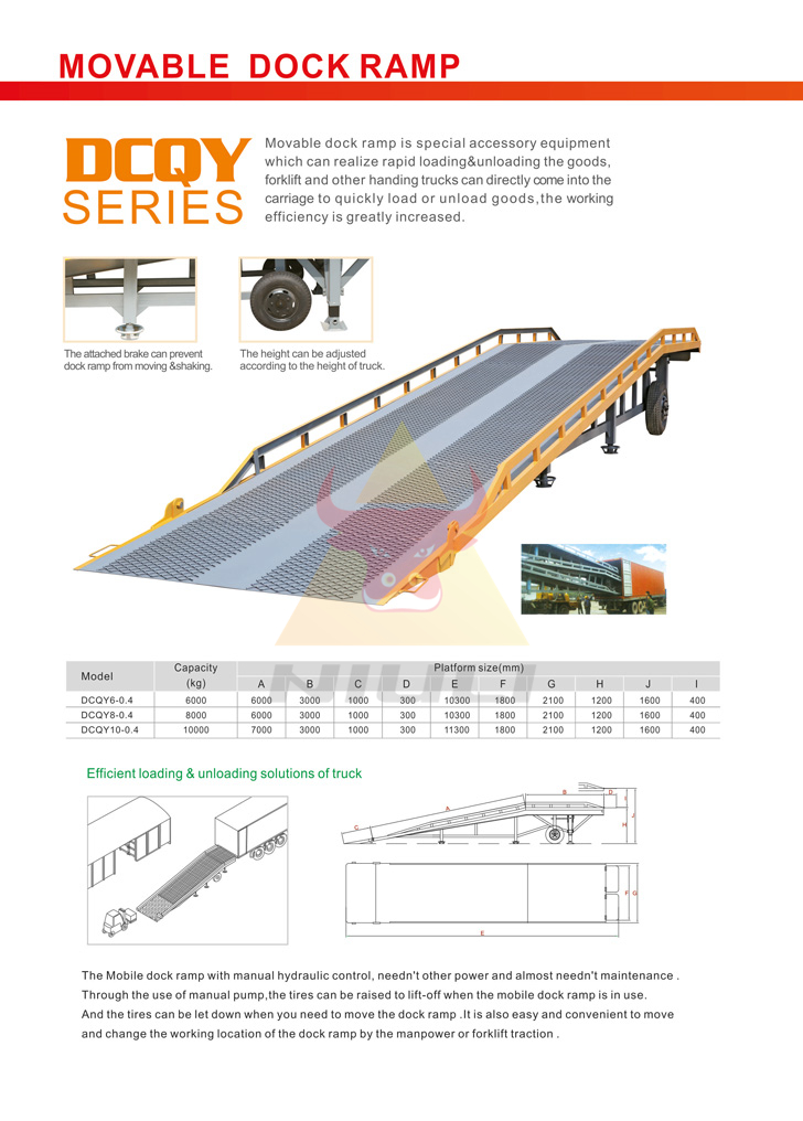 Movable dock ramp is special accessory equipment which can realize rapid loading & unloading the goods, forklift and other handing trucks can directly come into the carriage to quickly load or unload goods,the working efficiency is greatly increased.